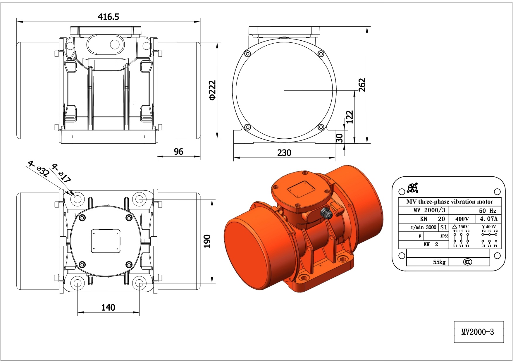 Silnik indukcyjny trójfazowy w obudowie wykonanej z żeliwa, zaprojektowany do pracy ciągłej (S1) o mocy 2000W (2kW), siła wymuszająca do 2000kg (regulowana mechanicznie).